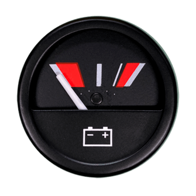 52mm waterproof battery indicator gauge with black dial white print and black flat bezel. Internal green illumination. 9-17Volts. Earth Return.