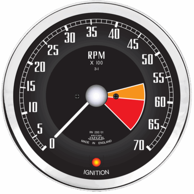 100mm (4in) 7K MGA Tachometer with half V chrome bezel, black dial, white print, moulded white pointer with pure aluminium centre, strap fixing, flood lit illumination and ignition warning light.