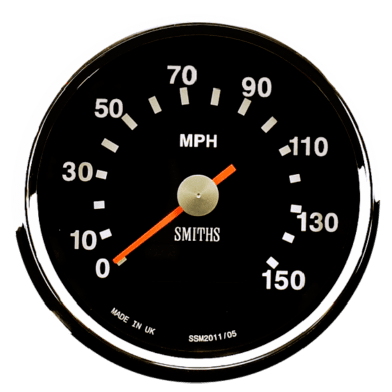 Smiths Classic black face 82mm (3in) Speedometer with odo or trip readout and onboard “drive-to-set” programming. Will fit original Smiths mounting brackets. Features our new billet case and is waterproof to IP 67. Available in MPH and KMH Scales